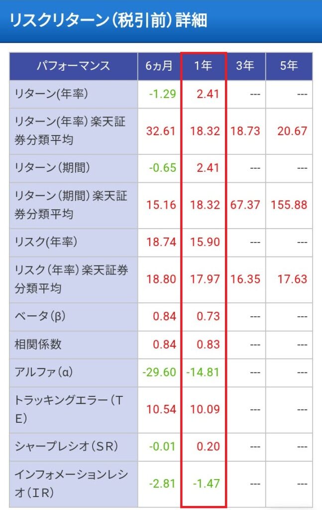 | インフォメーション レシオ(IR) | -1.47 | 市場平均に対するリターンの効率性 |