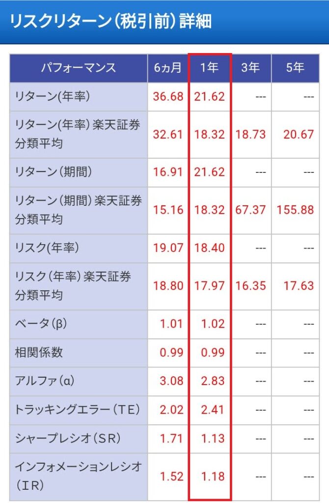 | ベータ(β) | 0.73 | 1.02 | 1より高いと優秀 |