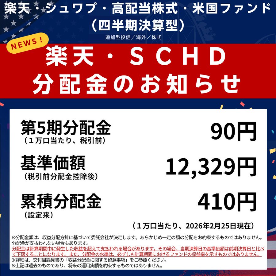 今年最初の楽天SCHD第5期分配金は1万口あたり90円でした🎊