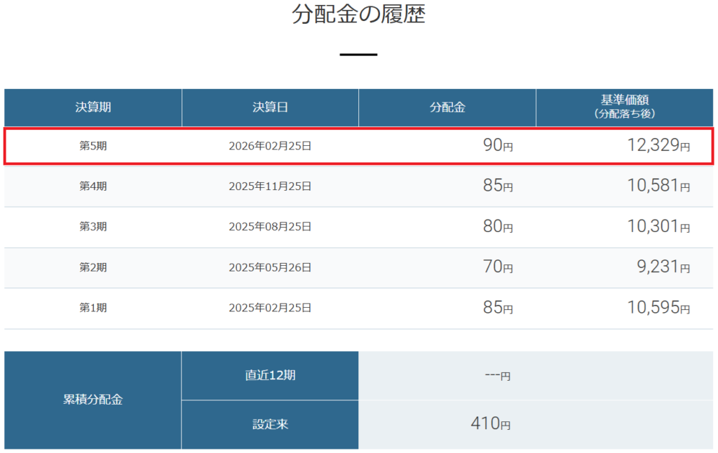 念願の第5期分配金90円が公表されました。