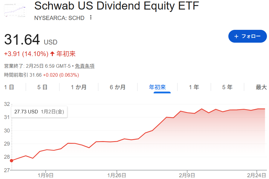 また、本家SCHDも年初来+14%と好調です。