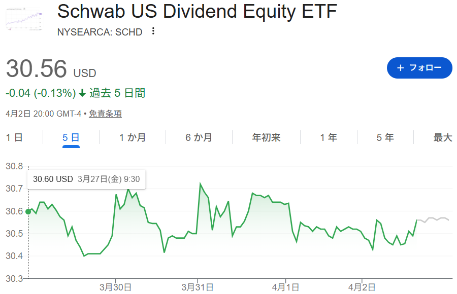 ●本家SCHDの週間騰落率は-0.13%、荒れた相場の中底堅く推移