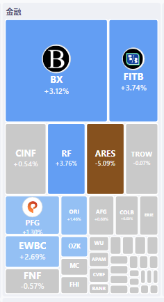 ・金融ではFITB+3.74%、RF+3.76%、BX+3.12%と底堅く推移