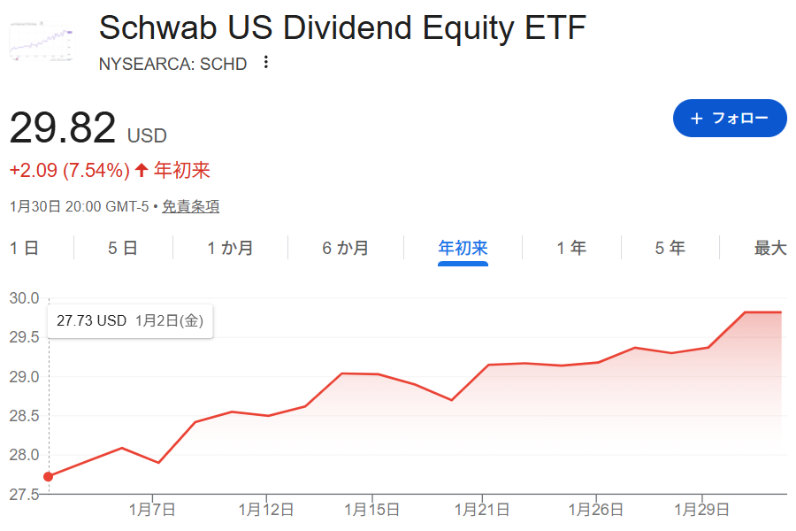 ●本家SCHDは、1ヶ月で+7.54%の大幅増。30USD(米ドル)も間近