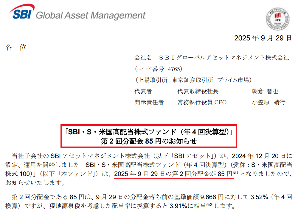 「SBI・S・米国高配当株式ファンド(年 4 回決算型)」第2回分配金85円のお知らせ