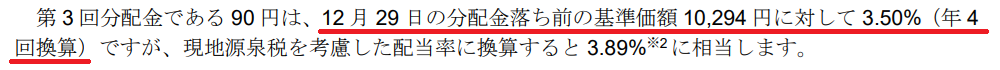 360円(90円×年4回)÷10,294円(分配金落ち前の基準価額)=3.50%です。