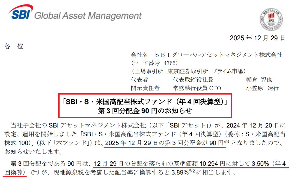 「SBI・S・米国高配当株式ファンド(年 4 回決算型)」初回分配金のお知らせ