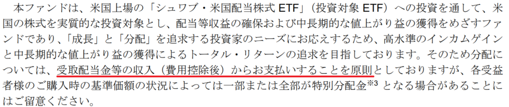 ・SBI・SCHDは、ファンドが実際に得た利益(配当金など)の範囲内で分配金を支払うという考え方